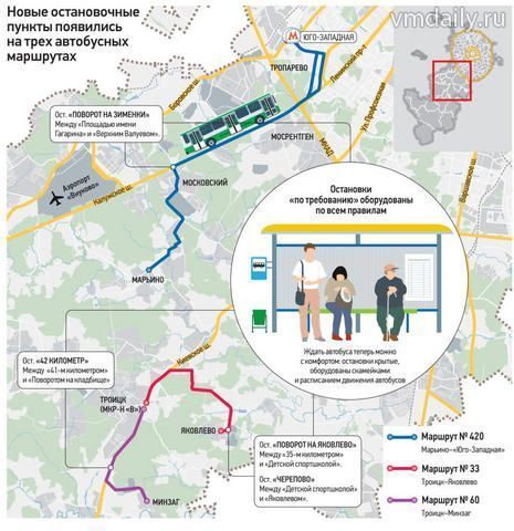 Всего до конца текущего года в ТиНАО в рамках государственной программы «Развитие транспортной системы на 2012–2016 годы» планируется открыть 25 новых остановок. Правда, не все из них будут дополнительными: часть просто перенесут или переоборудуют в связи с реконструкцией дорог. Новые остановочные павильоны планируется поставить на повороте трассы А-101 на Чичково, пересечении ее с Малым московским кольцом, на улице Полковника милиции Курочкина в Троицке, на протяжении Киевского шоссе, в Воронове и на других дорогах в населенных пунктах.
