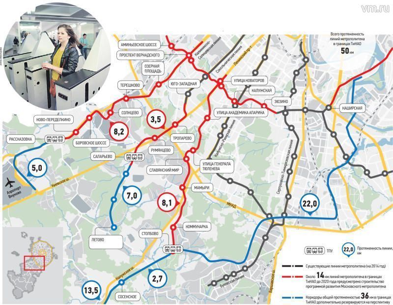 Совершенно ясно, что ТиНАО будет развиваться динамично: здесь появятся новые рабочие места, жилые районы. Уже создан задел на перспективу: на карту округов нанесены транспортные коридоры, по которым в обозримом будущем метро доберется до аэропорта «Внуково», до окраин Троицка, от Большого метрокольца через Бирюлево, по границе Бутова до московских уже Сосенок и дальше — на юго-запад.