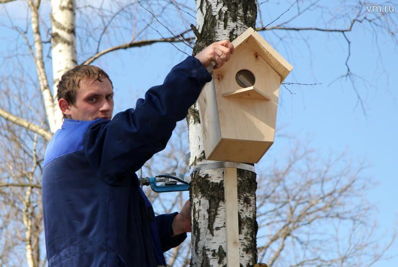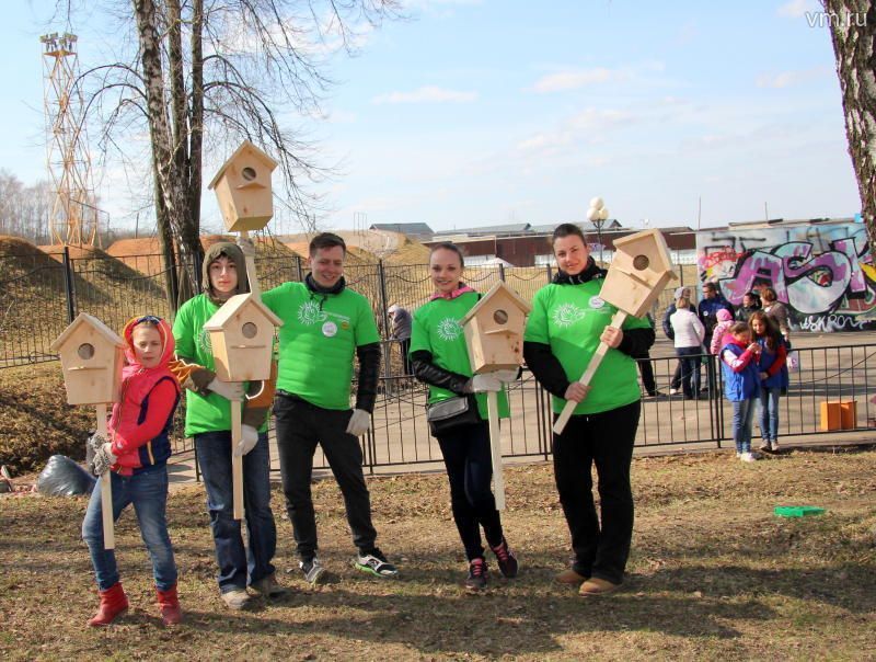 В рамках городского субботника в Красной Пахре прошла молодежная акция: активисты развесили на деревьях в парке скворечники.