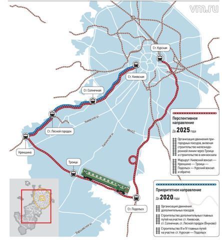 Чуть более близкая перспектива — строительство дополнительных главных путей на участке Москва-Пассажирская — Киевская — Солнечная — Лесной городок (Внуково) и на участке Москва-Пассажирская —Курская — Подольск. Срок — до 2020 года. Если говорить о ближайшей перспективе, то наиболее актуальна сейчас для железнодорожников реконструкция имеющихся путей, инфраструктуры станций, остановок и павильонов.