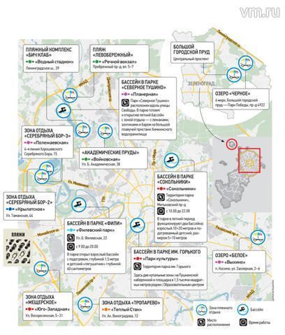 [BIGPICTURE=1]Кроме того, специалисты Роспотребнадзора по Москве подготовили список водоемов, не пригодных к купанию. Отдыхать в них не запрещено, но от погружения в воду лучше воздержаться. Хотя, несмотря на предостережения, отчаянные горожане продолжают устраивать заплывы. А зря. Как сообщил главный терапевт Департамента здравоохранения Москвы Владимир Тюрин, купание в запрещенных местах увеличивает риск подхватить кожное или инфекционное заболевание.