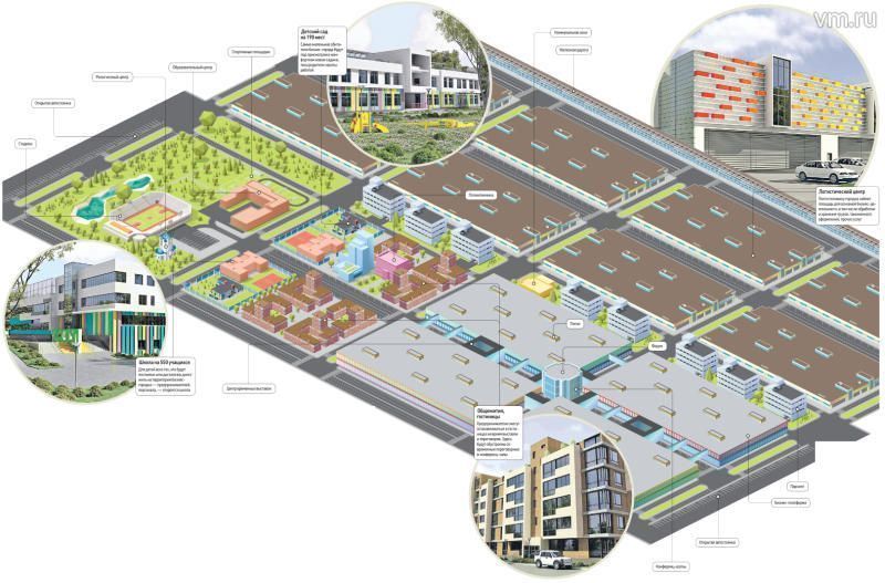 Самые маленькие обитатели бизнес-города будут под присмотром в комфортном новом садике, пока родители заняты работой Логистический центр Почти половину городка займет площадь для основной бизнес-деятельности, в том числе обработки и хранения грузов, таможенного оформления, прочих услуг
