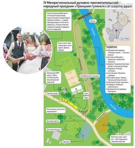 Здесь их встретили по всем обычаям Троицких гуляний: народными частушками, песнями и прибаутками, с хороводами. Молодых пригласили на мост, украшенный березовыми ветками, где они на счастье завязали красивый бант.