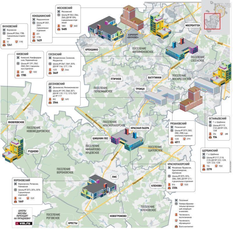 Напомним, что реорганизация школ началась в 2013 году. Создание образовательных комплексов обсуждалось с родителями, членами управляющих советов, педагогами, администрациями поселений и депутатами. В начале года первые комплексы были образованы в Вороновском и Кленовском поселениях. Сегодня их уже семь. А всего к концу года в ТиНАО организуют 11 образовательных комплексов.