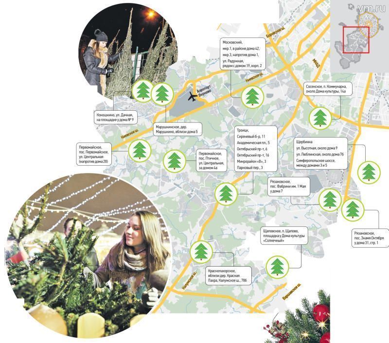 Уже сейчас радует глаз красочная подсветка, которая от недели к неделе будет становиться все ярче и многообразнее. Смотришь на все это, и кажется, что уже носится в воздухе запах хвои. В общем-то, это неудивительно: префектура уже определила места организации елочных базаров в этом году. Рекордсменом по их числу становится на этот раз Троицк: на его территории будет открыто сразу шесть точек по продаже пушистых хвойных красавиц, в Щербинке и Московском — по три елочных базара, в Рязановском и Первомайском — по два, в остальных поселениях — по одному.