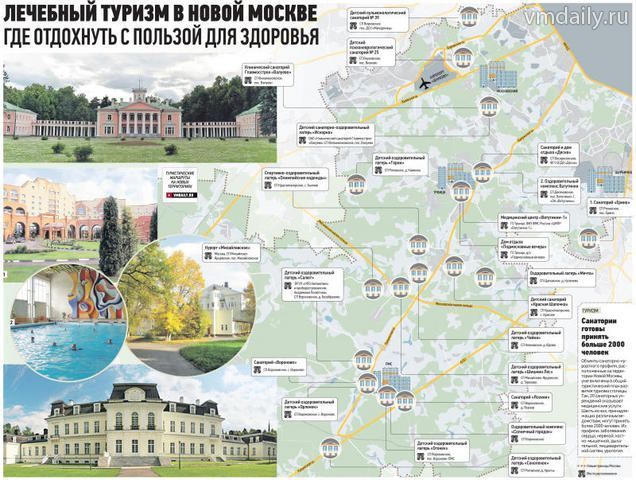 Объекты санаторно-курортного профиля, расположенные на территории Новой Москвы, уже включены в общий туристический план развития туризма столицы. Так, 20 санаторных учреждений оказывают медицинские услуги. Шесть из них, принадлежащих различным ведомствам, могут принять более 2000 человек. Их профили: заболевания сердца, нервной, костно-мышечной, дыхательной, пищеварительной систем, урология.