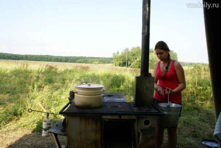 Разместились ребята в шести палатках. На полевой кухне повар готовит горячую еду.