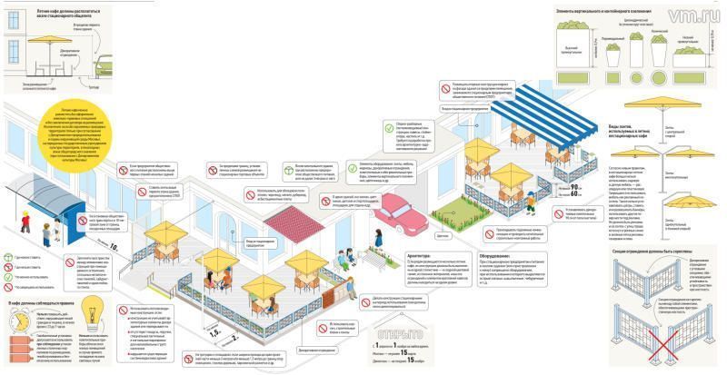 Согласно принятым городскими властями новым правилам организации летних кафе все сезонные кафе должны быть построены из легковозводимых конструкций, а не из железобетона, кирпича или металлического профнастила. Они должны быть выдержаны в стилистике окружающих построек, не разрушая архитектурно-художественного единства комплексов застройки. Правда, и в старой Москве изменения, касающиеся сезонных кафе, реально заработают не сразу и не везде. С 18 июня они вошли в силу внутри Бульварного кольца, к 1 января 2015 года затронут район Третьего транспортного кольца. В последнюю очередь эти правила начнут применяться в ТиНАО. И на то есть вполне объективные причины.