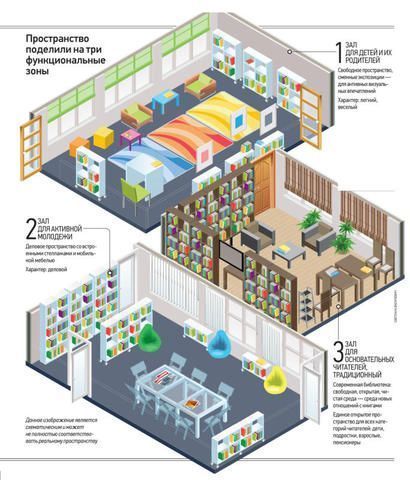 Из единого некогда пространства сделали три отдельные зоны: для детей и их родителей, для активной молодежи, зону в классическом стиле — для «основательных читателей».