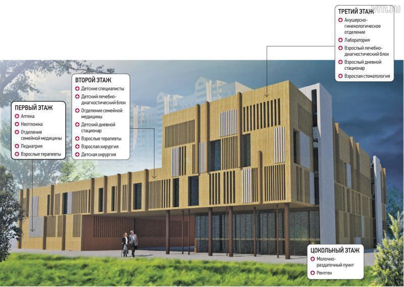 [BIGPICTURE=1]— Каждый блок поликлиники имеет отдельный вход. В то же время лечебнодиагностические и другие службы, использующиеся совместно и детским, и взрослым отделениями, размещены в зонах примыкания их площадей: например, на втором этаже детская и взрослая поликлиники примыкают к блокам хирургических отделений, что позволяет обеспечить совместную деятельность врачей. Такие решения призваны увеличить эффективность работы медцентра, чтобы жители Новых Ватутинок могли быть уверены, что в любой момент смогут получить высококвалифицированную помощь, — рассказал представитель застройщика Александр Зубец.