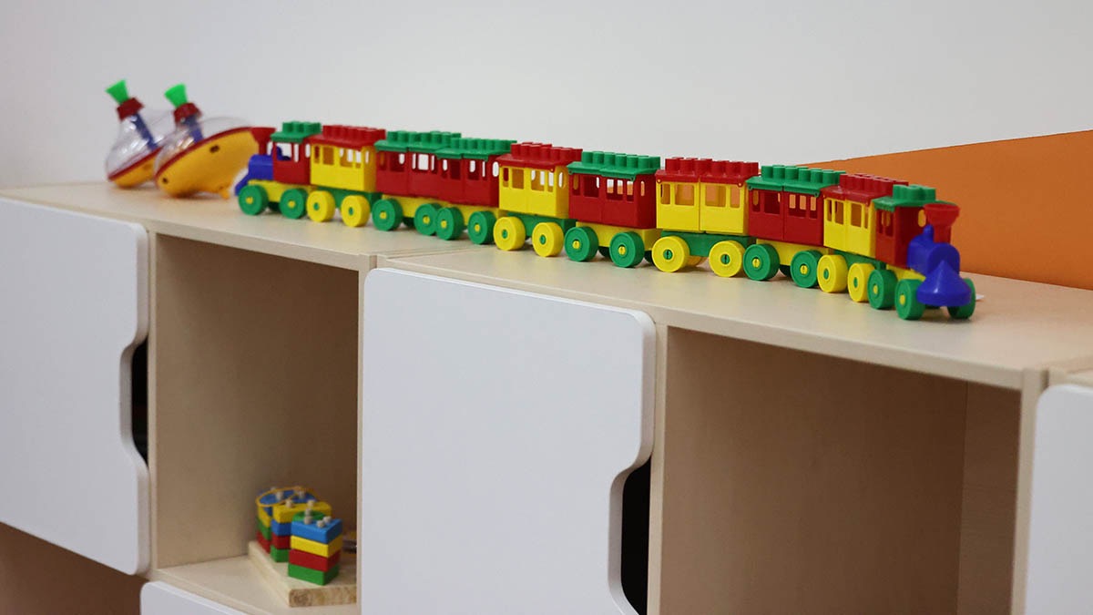 Элементы на фасаде изготавливают из металлокассет ярких цветов: голубого, желтого, оранжевого и салатового. Этот же игривый мотив повторяется в оформлении козырьков над входами. Стены, выполненные в графитовом оттенке, служат фоном для ярких деталей, создавая гармоничный образ.
