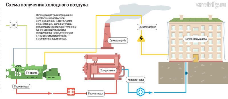 —Сначала нужно объяснить, как работают когенерационные станции. Принцип такой: обычные газопоршневые двигатели путем сжигания газа вырабатывают электроэнергию и тепло, которые поступают через систему теплообменников в систему теплоснабжения. Тем самым все тепло, которое попутно выделяется при выработке электроэнергии, не выбрасывается, а идет в систему теплоснабжения. Когда на когенерационную станцию ставится дополнительный (холодильный) модуль, она превращается в тригенерационную. Когда жарко и тепло девать некуда, оно направляется в абсорбционную холодильную машину. Здесь происходит охлаждение воды до температуры 5–7 градусов, затем вода направляется в систему вентиляции и кондиционирования здания, где она и охлаждает воздух. Происходит это без дополнительных затрат электроэнергии.