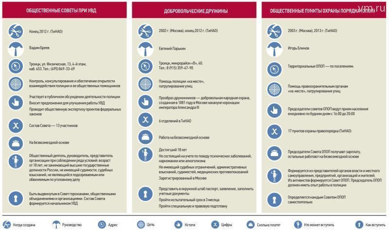 Если вы не чувствуете себя в силах патрулировать улицы, вы можете просто сообщать на горячие линии служб о нарушениях. Но если вы готовы активно участвовать в жизни города, то вас с радостью встретят в отрядах. Сегодня в Новой Москве их шесть: в Троицке, Щербинке, Краснопахорском, Щапове, Сосенском и Московском. Народные дружины в ТиНАО начали создаваться с января прошлого года, все они — подразделения Московского городского штаба народной дружины. Дружинники помогают также Федеральной миграционной службе, Службе исполнения наказаний. Префектура уже внесла предложение о создании еще пяти дружин — в поселениях Киевское, Воронов с к о е , Первомайское, Воскресенское и Рязановское.