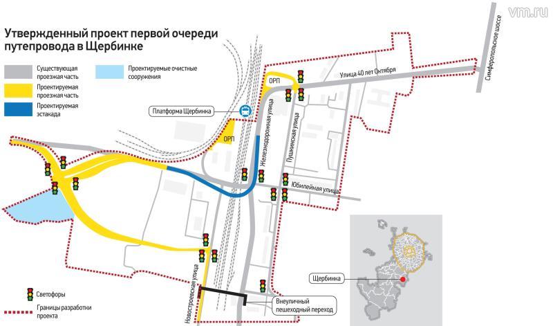 У платформы Щербинка будет создан транспортно-пересадочный узел с разворотными площадками для автобусов. Светофоры установят на пересечении улиц 40 лет Октября и Пушкинская, Железнодорожная и Юбилейная, Староникольская и Проектируемый проезд.