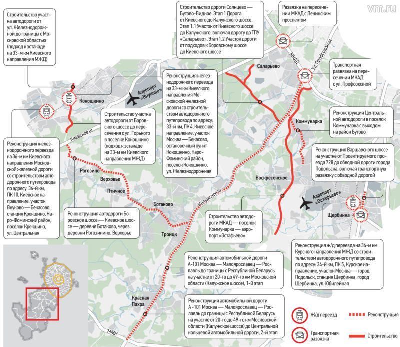• Строительство дороги Солнцево — Бутово-Видное. Этап 1 Дорога от Киевского до Калужского шоссе. Этап 1.1 Участок от Киевского шоссе до Калужского, включая дорогу до ТПУ «Саларьево». Этап 1.2 Участок дороги от подходов к Боровскому шоссе до Киевского шоссе