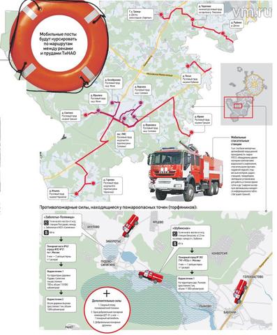 Департаментом природопользования и охраны окружающей среды Москвы и окружным Управлением МЧС разработана картасхема территории ТиНАО с указанием мест дислокации техники, забора воды, вертолетных площадок.