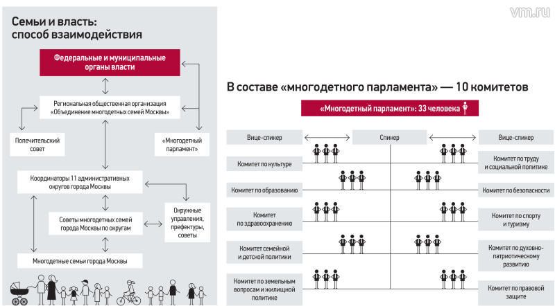 Парламент создан для взаимодействия ОМСМ с федеральными и муниципальными властями. Члены парламента, многодетные мамы и папы участвуют в круглых столах, парламентских слушаниях, выступая за улучшение качества жизни семей, воспитывающих троих и более детей. В ТиНАО в Щербинке действует организация «Многодетная семья — крепость моя», входящая в состав ОМСМ.
