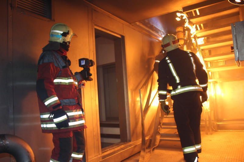 Другие элементы тренажера — участок горения газа на трубопроводе, горящая лестница, имитация квартиры. В помещениях создаются высокая температура и открытые очаги пламени.