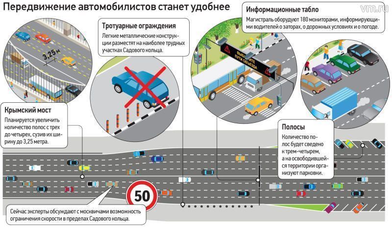 Первое из них заключается в том, что количество полос на всем протяжении Садового кольца будет сведено к трем-четырем, — сообщил заместитель руководителя Центра организации дорожного движения (ЦОДД) Александр Поляков. По его словам, это улучшит ситуацию на дорогах. Ведь на всем протяжении Садового число транспортных полос постоянно меняется: девять в районе Зубовского бульвара упираются в три в районе Крымского моста, а на участке до станции метро «Октябрьская» их уже пять.
