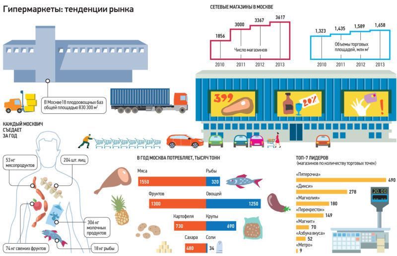 Сетевая розничная торговля продуктами в Москве занимает уже более 40 процентов рынка. Динамично развиваются сетевые магазины формата гипермаркет и супермаркет. Гипермаркеты представляют как зарубежные, так и российские торговые сети: Auchan, Auchan-city, «Мосмарт», «Наш», «О’Кей». Вторая тенденция — рост специализированных магазинов, где представлен выбор товаров собственного производства: колбас, «кондитерки». Однако развитие сетевой торговли тормозится из-за нехватки площадей, удовлетворяющих запросам продуктовых ритейлеров.