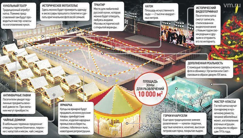 На Поклонной горе 6 декабря откроется уникальный исторический каток. Его создатели утверждают: на коньках можно перемещаться не только в пространстве, но и во времени! Анимационные программы на катке «Елки-1914» расскажут о жизни людей в царское время, ровно сто лет назад. На лед выйдут титулованные дворяне и обычные крестьяне, царская семья и солдаты Первой мировой войны.