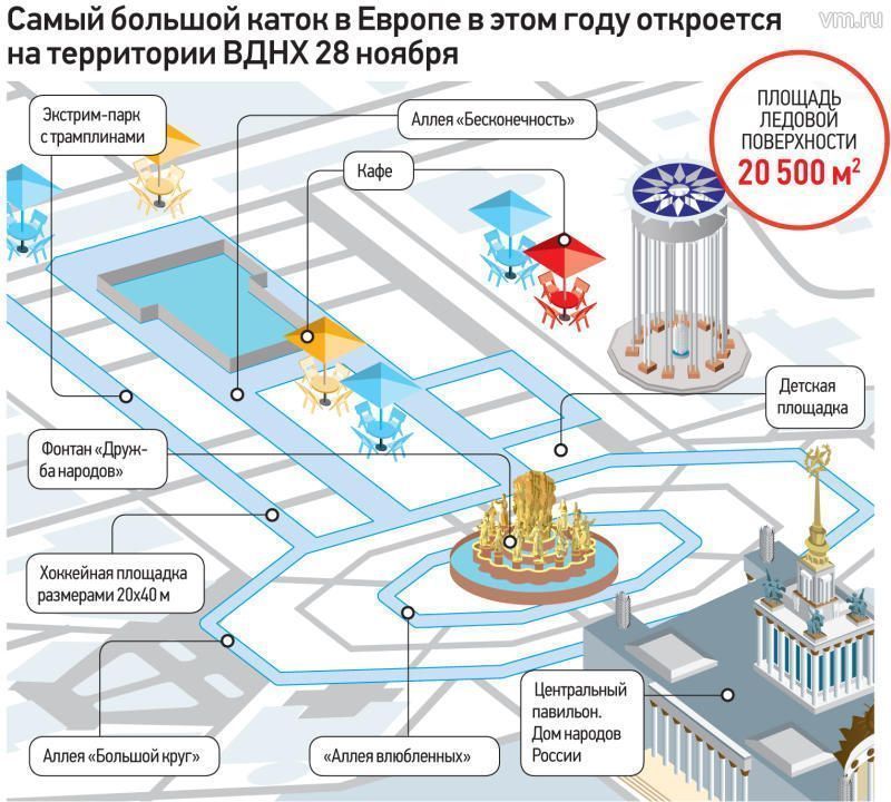 Каток на ВДНХ, старт работы которого назначен на 28 ноября, станет самым большим в Европе. Это звание, ранее принадлежавшее катку парка Горького, «рекордсмен» завоевал благодаря поистине русскому размаху: площадь ледовой поверхности составит 20,5 тысячи квадратных метров. Лед будет разделен на несколько зон для посетителей различных возрастов и любителей разных стилей катания. Одновременно каток сможет принимать 4,5 тысячи человек.
