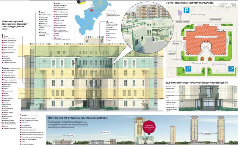 Новая поликлиника — это шестиэтажное здание площадью более 7000 квадратных метров. Учреждение рассчитано на 300 посещений в смену. Вокруг здания запроектированы пешеходные тротуары и дорожки, автостоянка, озеленение — газоны, кустарники, цветники. Здание будет удобно для использования в том числе и маломобильными группами населения.