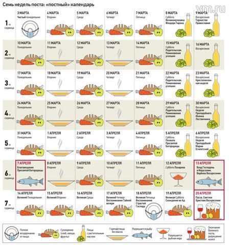 — Великий пост длится сорок дней. В это время запрещается употребление в пищу продуктов животного происхождения — мяса, молока, яиц, рыбы. С понедельника по пятницу, если на эти дни не приходится праздник, не употребляется и растительное масло. Рыба разрешается всего два раза: на Благовещение Пресвятой Богородицы (7 апреля) и на Вербное воскресенье. В Лазареву субботу разрешается икра. В остальные субботы и воскресенья поста, Великий четверток (Страстной четверг) и в дни некоторых особо чтимых святых разрешается растительное масло.