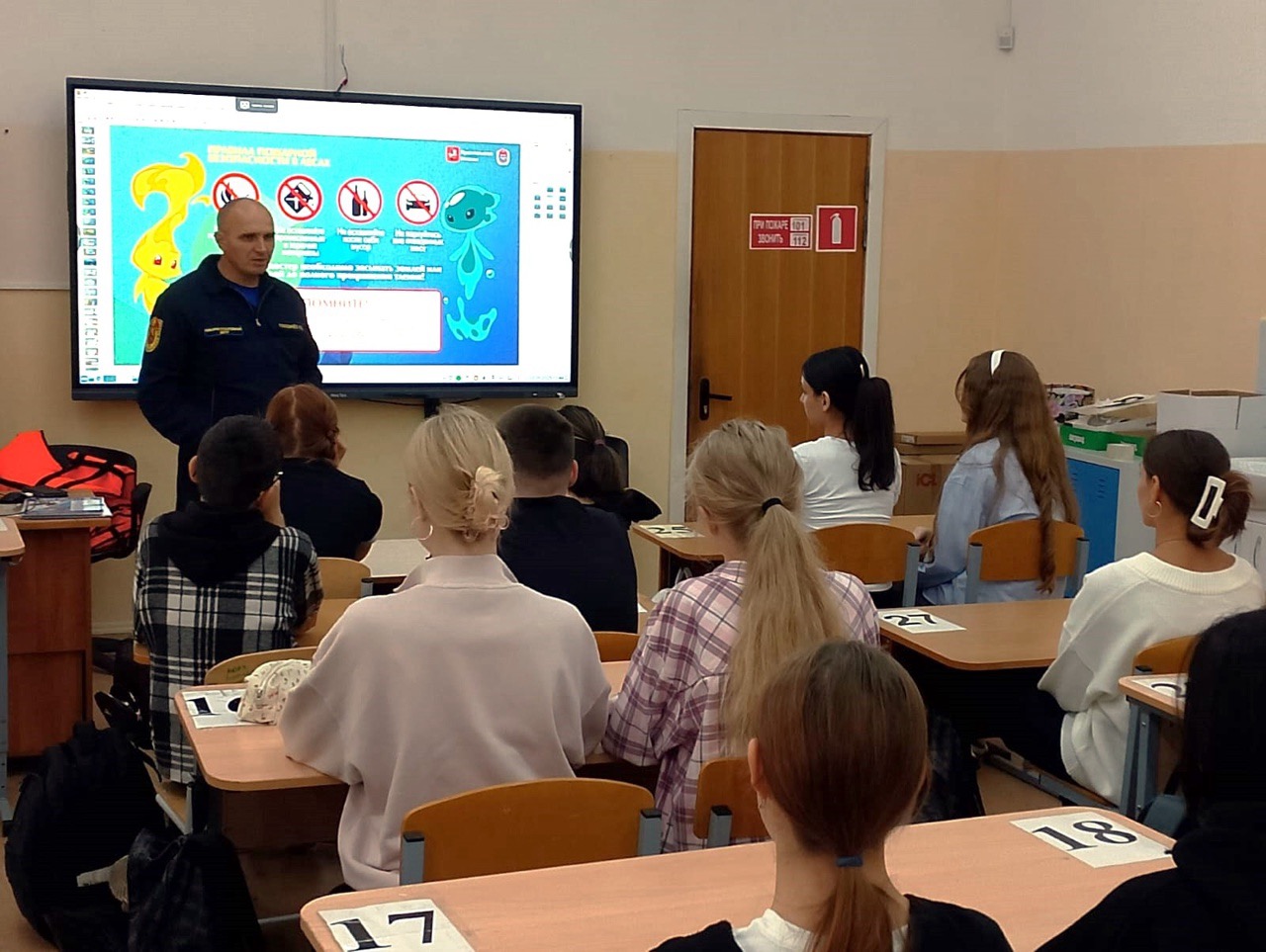 Специалисты выступили перед ребятами на уроках по основам безопасности жизнедеятельности. Спасатели разъяснили, что делать при возникновении возгорания, а также при оказании первой помощи. Кроме того, были озвучены номера телефонов экстренных служб и правила эвакуации из школы при возникновении опасности. Также дети узнали, как вести себя у воды в осенний период.