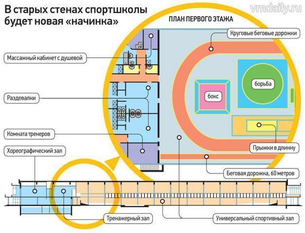 Спортшкола сохранит существующие стены. Внутри будет универсальный спортзал площадью 2315 квадратных метров. Здесь можно будет проводить занятия по мини-футболу, волейболу и теннису. В спорткомплексе появятся площадки для борьбы и бокса, сектор для прыжков в длину. Три круговые беговые дорожки и прямую дорожку на 60 метров тоже ждет реконструкция. Кроме гардероба, раздевалок и тренерских комнат, на первом этаже разместятся буфет, медпункт и сауна с массажным кабинетом. Второй этаж вместит хореографический и тренажерный залы — высота потолка здесь будет не меньше четырех метров.