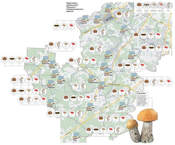 В этом смысле Новомосковский округ уступает Троицкому: ближе к центру города строительство ведется более интенсивно, грибы потихоньку отступают перед натиском домов и машин. В Троицком же округе что ни поселение — сокровищница для грибника. Принцип тот же: чем дальше от населенных пунктов, тем больше грибов.