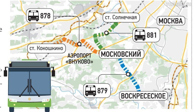 Все три предназначены для нужд жителей поселения Московский. Два, № 878 и № 879, начинаются в 1-м микрорайоне Московского, третий, № 881, в микрорайоне Град Московский. Автобусы, курсирующие по маршруту № 878, довозят пассажиров до Кокошкина. А конечная остановка маршрута № 879 организована в совхозе «Воскресенское». Маршрут № 881 соединил Град Московский и станцию Солнечная.