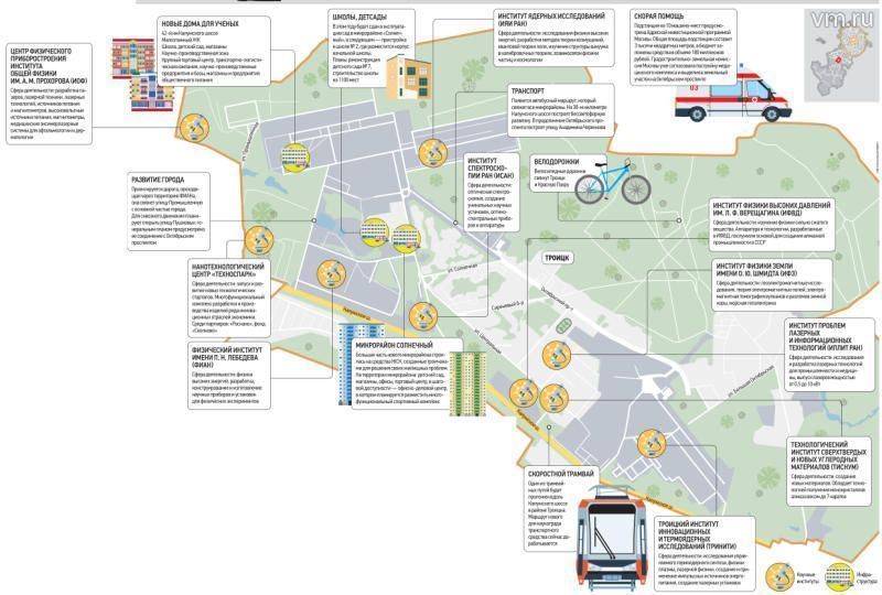 Позже были построены и начали работать другие институты: Физический институт имени П. Н. Лебедева РАН (ФИАН), Институт физики высоких давлений им. Л. Ф. Верещагина РАН (ИФВД), Институт ядерных исследований РАН (ИЯИ), Институт спектроскопии РАН (ИСАН), Технологический институт сверхтвердых и новых углеродных материалов (ФГУ ТИСНУМ), Центр геоэлектромагнитных исследований Института физики Земли имени О. Ю. Шмидта РАН (ЦГЭМИ ИФЗ РАН), Центр физического приборостроения Института общей физики им. А. М. Прохорова РАН (ЦФП ИОФ РАН), Отделение перспективных лазерных технологий Института проблем лазерных и информационных технологий РАН (ИПЛИТ РАН). На карте Троицка территории институтов выделены светло-серым цветом. Обилие серых пятен наглядно показывает, какое место здесь отведено науке.