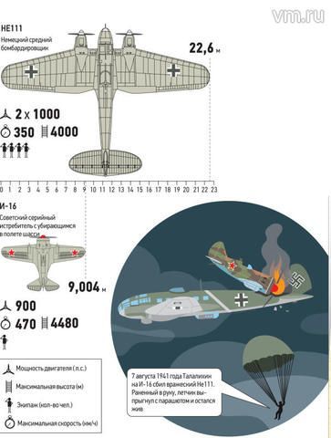 — 27 октября 1941 года два МиГ-3 и четыре И-16 под командованием Талалихина вылетели на прикрытие советских войск в район деревни Каменка. Облака прижимали летчиков к земле, видимость была плохая. Они заметили шесть мессершмитов. «Действовать по звеньям!» — приказал Талалихин. Он вступил в бой первым, сбил врага.
