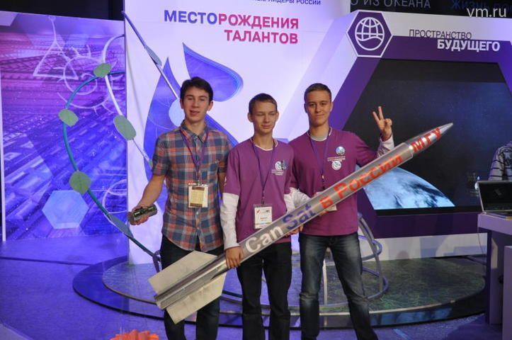 Виталий Бирюков, Николай Волков и Евгений Севастьянов с руководителями Татьяной Бирюковой (учитель информатики) и Дмитрием Лисиным (сотрудник Института земного магнетизма, ионосферы и распространения радиоволн (И ЗМИРАН) попала на форум после успешного выступления на Фестивале науки и Втором Всероссийском чемпионате CanSat.