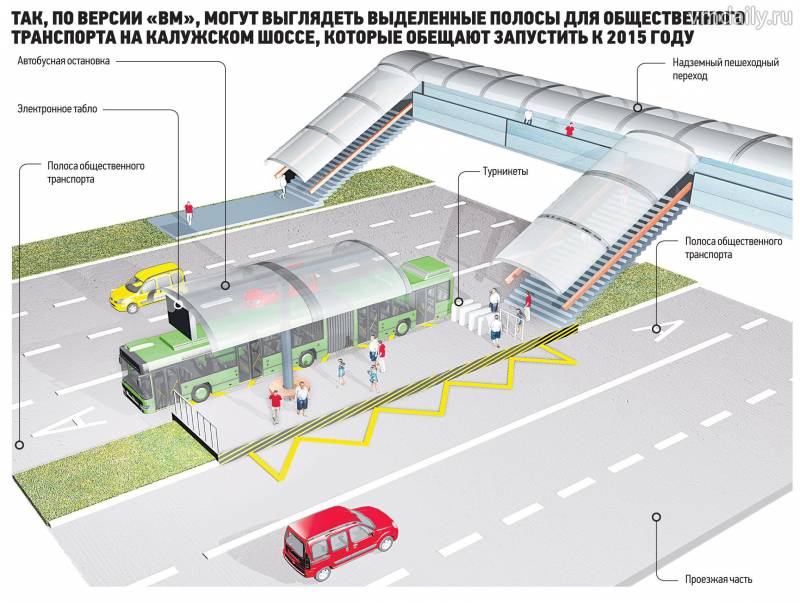 Правда, каким именно образом будут организованы посадка и высадка пассажиров при таком расположении выделенных полос, пока до конца не ясно. Один из возможных вариантов мы предлагаем сегодня на рассмотрение нашим читателям (см. инфографику). Помимо автобусов, осуществлять пассажирские перевозки будут железные дороги и метрополитен. По словам Кузьмина, планы развития подземки до 2020 года подразумевают строительство 150 километров новых линий, это, как говорится, «две пятилетки с заделом». Вот этот самый «задел» и подразумевает выход метро на территорию Новой Москвы – первая станция метро здесь появится уже через год, в Румянцево.