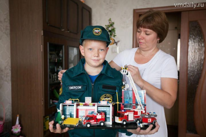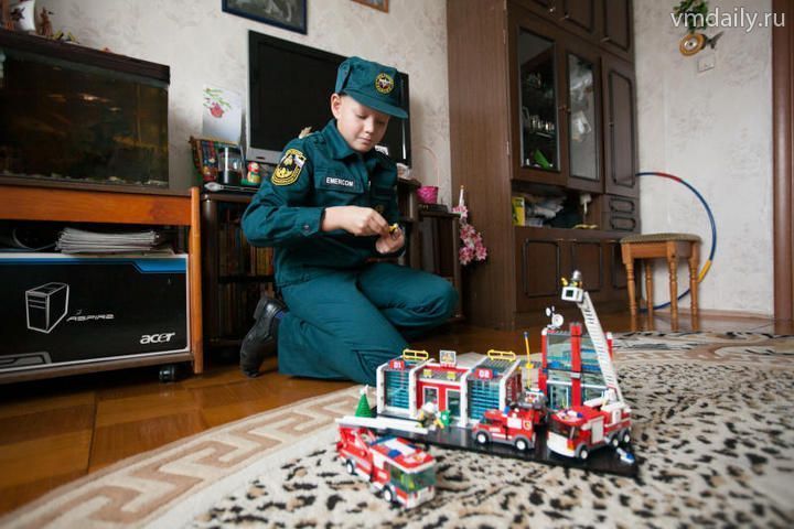 Дома у Зайцевых все говорит об увлечении сына. На полу стоит большой конструктор — пожарная станция. На стене — азбука МЧС, на столе — книги, среди которых «Хроника событий МЧС».